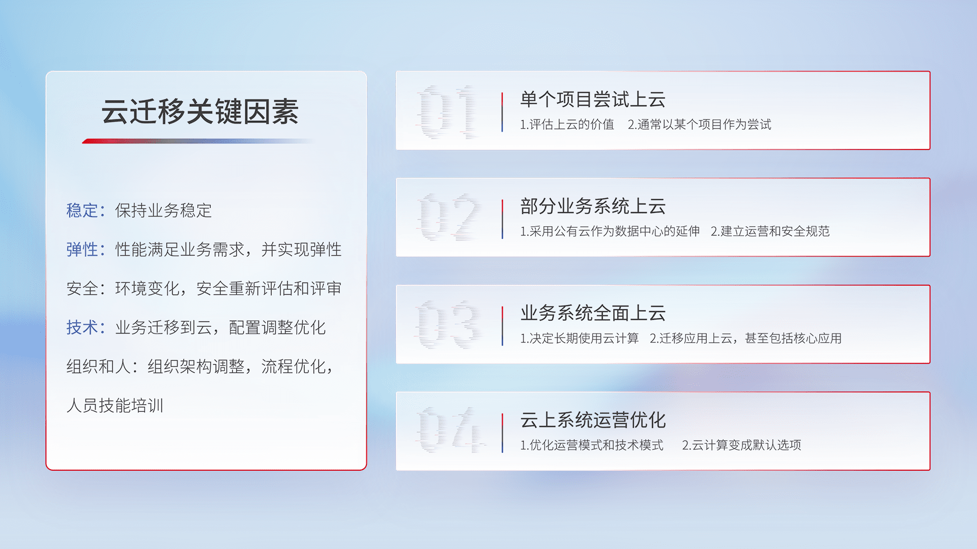 结合实际业务,,从规划设计、、云平台选型、、、云原生改造、、、数据迁移、、集成交付,,,,迁移全过程为客户识别最佳上云路径,,做好风险识别管理,,,设计网络架构、、、、身份权限、、、、安全审计合规、、、、操作审计、、、、日志审计、、监控告警策略、、多站点容灾设计等,,对云上基础设施进行整体规划,,,,提升IT治理水平,,以满足弹性、、高可用、、高性能的需求。。。
