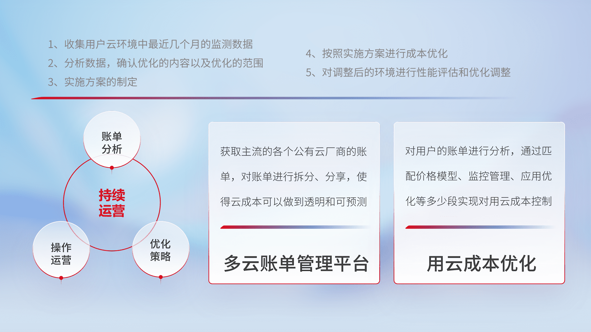 通过多云纳管,,以统一的资源数据模型把客户的云资源进行抽象和封装,,,进而实现对多云资源的统一操作,,,保障云资源管理的可靠性、、稳定性与可用性。。。。量身定制化运维内容,,,,配置、、、开发运维、、补丁管理、、、备份、、监控、、、、认证和访问管理、、审计和日常巡检等,,,,保障在用云过程中的可靠度,,,稳定度以及高可用率。。。。