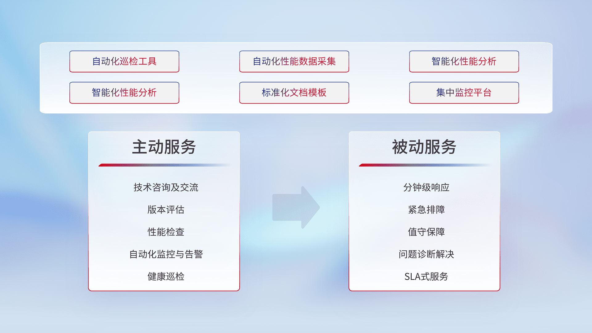 智能化工具和标准化文档,,,保障服务质量,,,提供主动服务(包含技术咨询、、、、版本评估、、、性能检查、、自动化监控与告警、、、健康巡检)和被动服务包含(分钟级响应、、紧急排障、、、、值守保障、、、、问题诊断解决、、、、SLA服务)。。。。